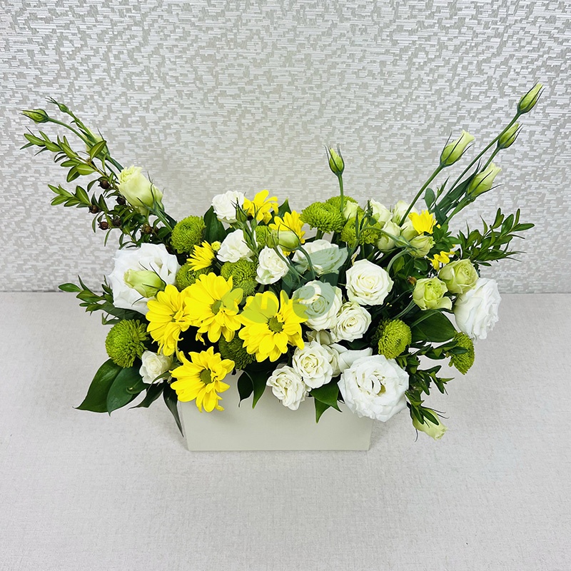 Облако кустовых роз и желтые хризантемы в коробке – такую прелесть можно заказать с доставкой в любой район.